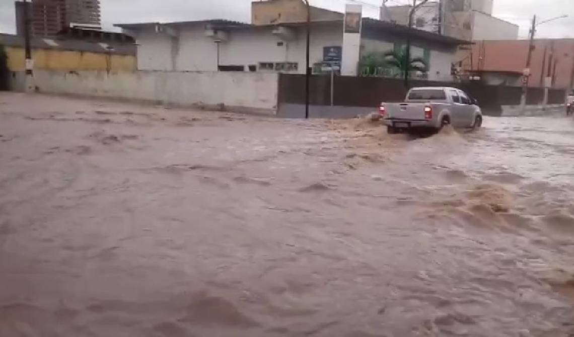 carro submerso na rua Nelson Alencar. Equipes da Prefeitura já iniciaram