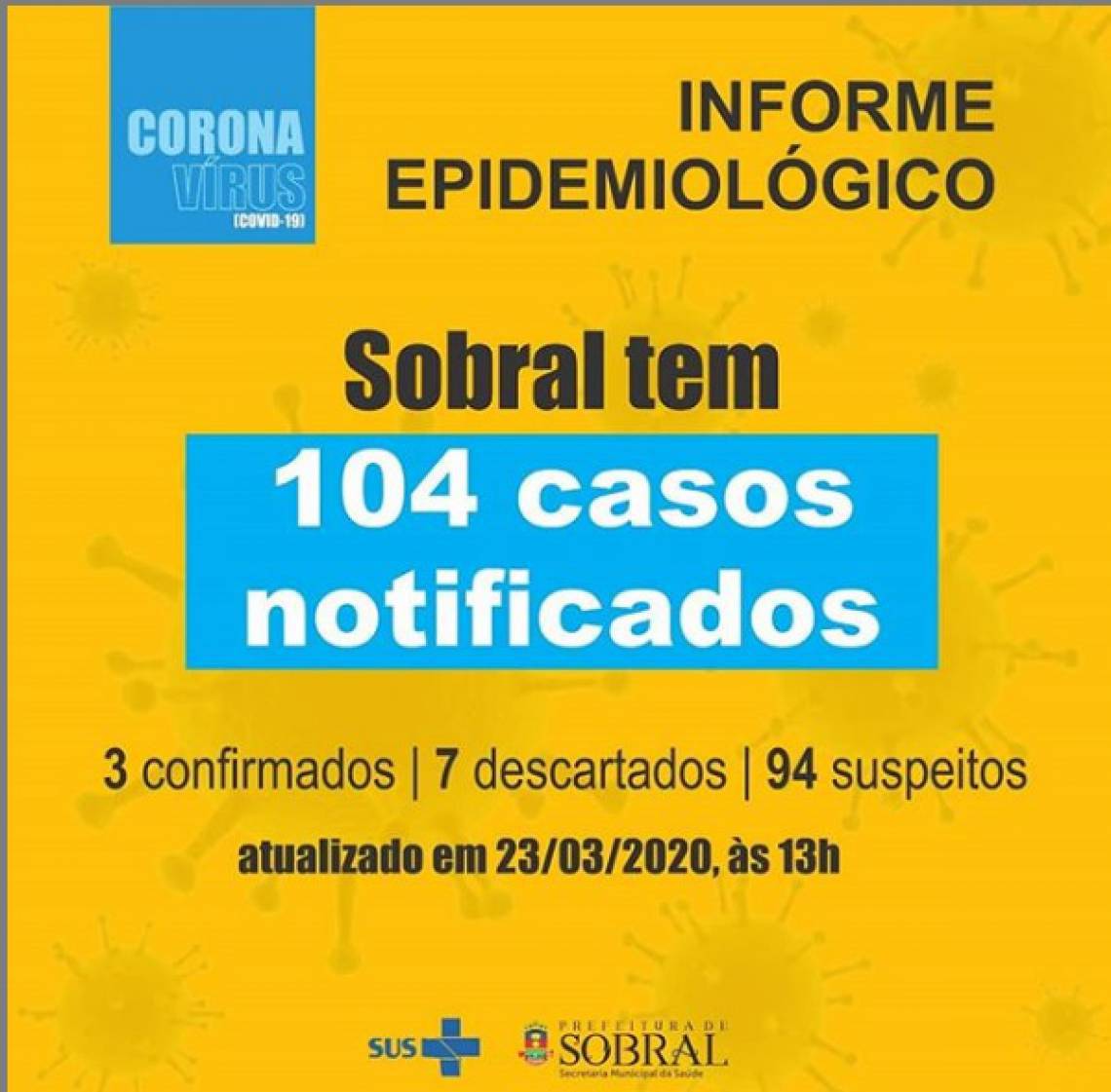 No boletim anterior, de domingo, 22 de março, Sobral tinha um caso confirmado. Até o domingo, apenas Fortaleza, com 116 casos, e Aquiraz, com 5, tinham mais de um caso confirmado no Estado.