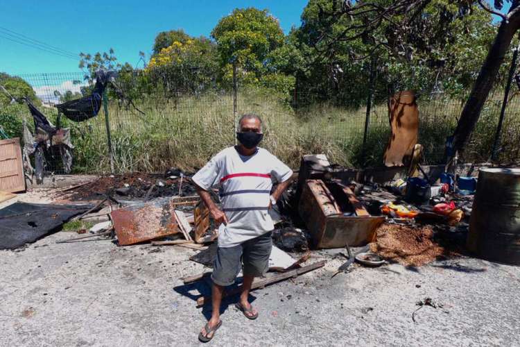 Jesus Maciel tem 71 anos e está nas ruas há 17. Há cerca de dois anos, ele mora em um um barraco no bairro Cambeba, em Fortaleza. O homem teve o local onde vive incendiado na madrugada deste domingo, 2. Ocorrência foi atendida Corpo de Bombeiros Militar do Estado do Ceará (CBMCE).