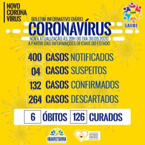 O município confirma ainda 132 casos com 126 pacientes recuperados e outros 264 descartados. Ibaretama tem ainda 4 pacientes suspeitos e 400 notificações.