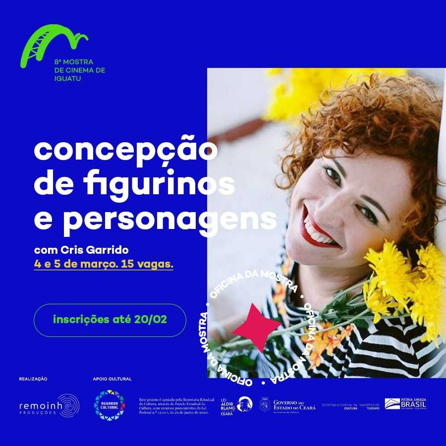 Como parte seu eixo formativo, a 8ª edição da Mostra de Cinema de Iguatu ocorre entre os dias 03 e 07 de março, totalmente online e gratuita. Uma de suas oficinas com inscrições abertas até 20 de fevereiro será ministrada por Cris Garrido, sobre o tema “Concepção de Figurino e Personagens”. As inscrições podem ser feitas através de linktr.ee/mostracineiguatu ou no link da bio no Instagram @mostracineiguatu.