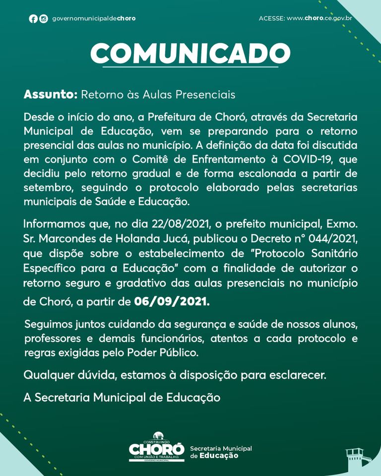 A prefeitura de Choró, no entanto, não deixou claro se continuará com o ensino de forma híbrida, ofertando a modalidade remota para os alunos que não se sentirem seguros para voltar neste momento a sala de aula.