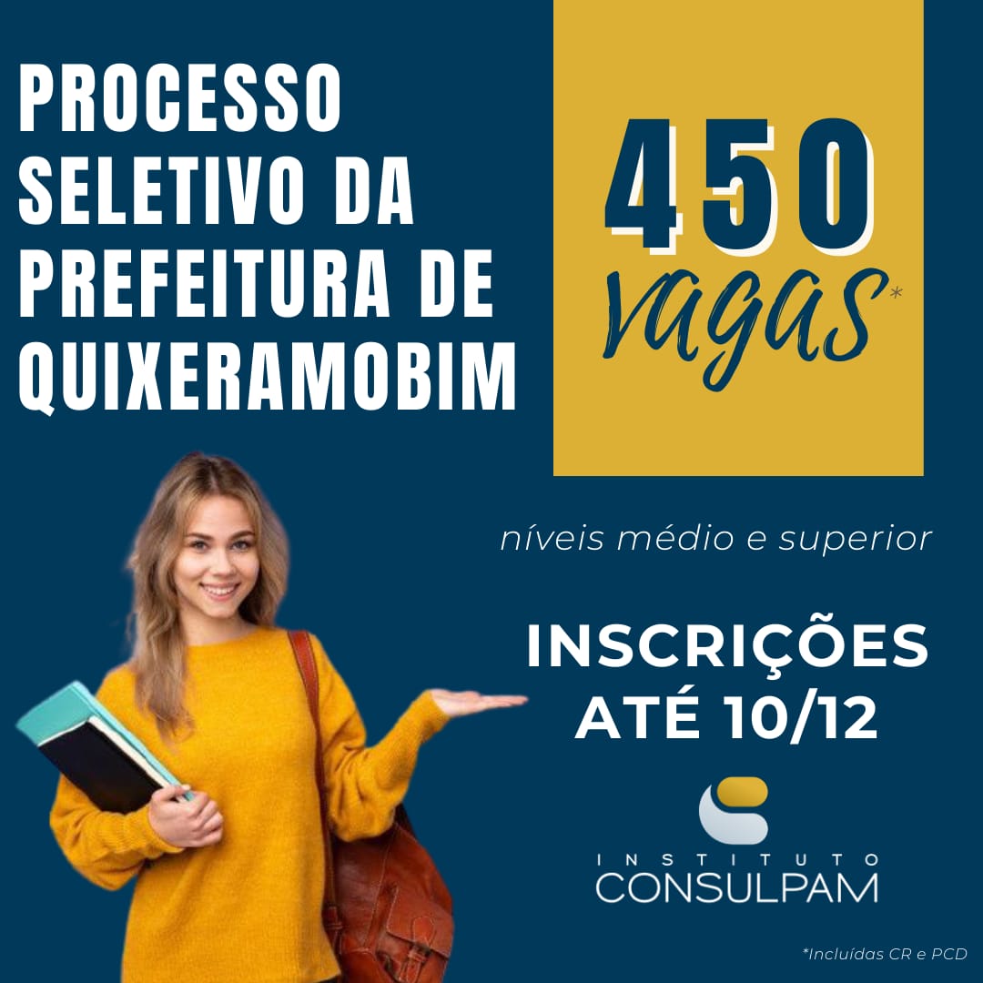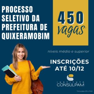 A Prefeitura de Quixeramobim lançou processo seletivo para preenchimento de cargos de natureza temporária em seu quadro de servidores. No total, estão sendo ofertadas 450 vagas para 60 cargos de níveis médio e superior, incluindo as de reserva e as de pessoas com deficiência.