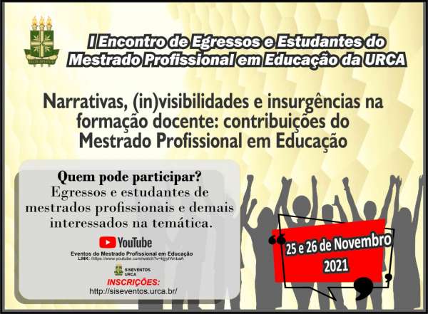 Com o tema “Narrativas, (in)visibilidades e insurgências na formação docente: contribuições do Mestrado Profissional em Educação”, a Universidade Regional do Cariri (URCA) realizará o I Encontro de Egressos e Estudantes do Mestrado Profissional em Educação, nos dias 25 e 26 de novembro de 2021.