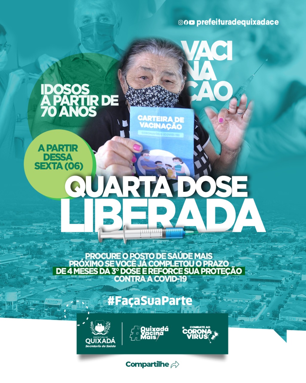 O município de Quixadá inicia nessa sexta-feira (06) a aplicação da quarta dose da vacina contra a COVID-19 em idosos a partir de 70 anos que já estejam com pelo menos quatro meses de intervalo da terceira dose. A vacinação acontece nos postos de saúde e é necessário apresentar o cartão do SUS e cartão de vacinação.