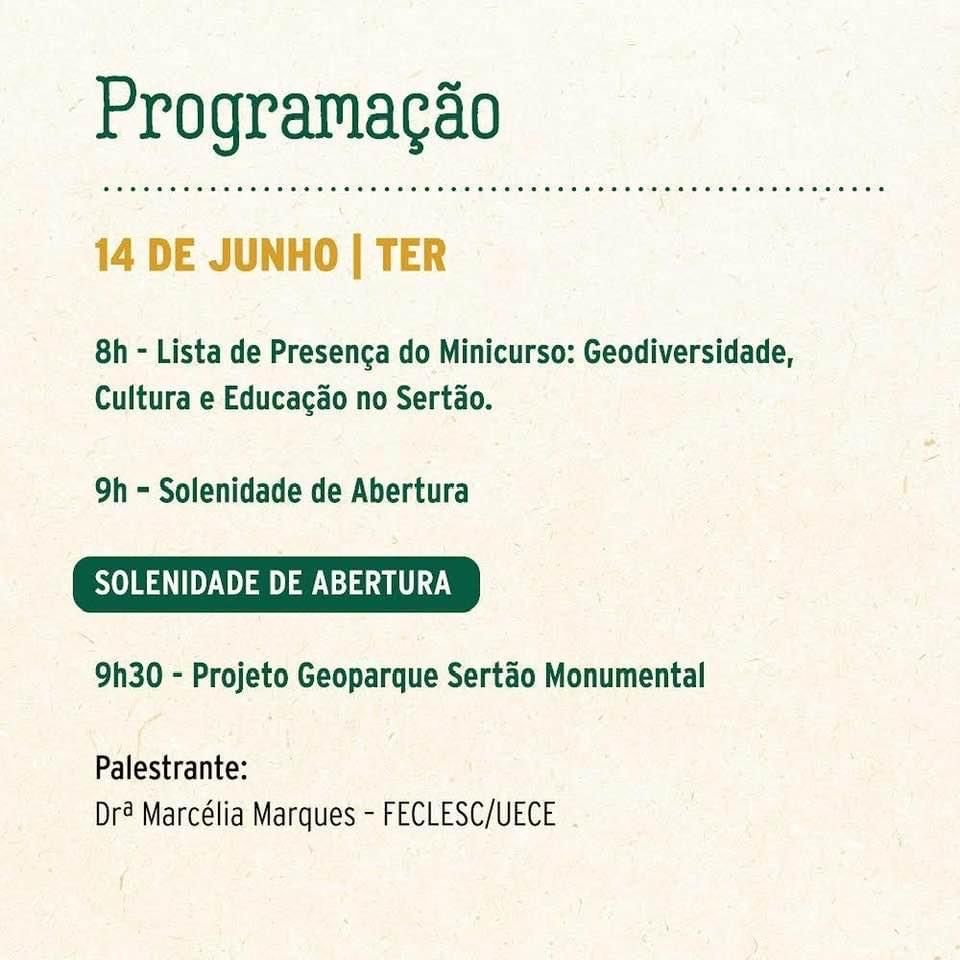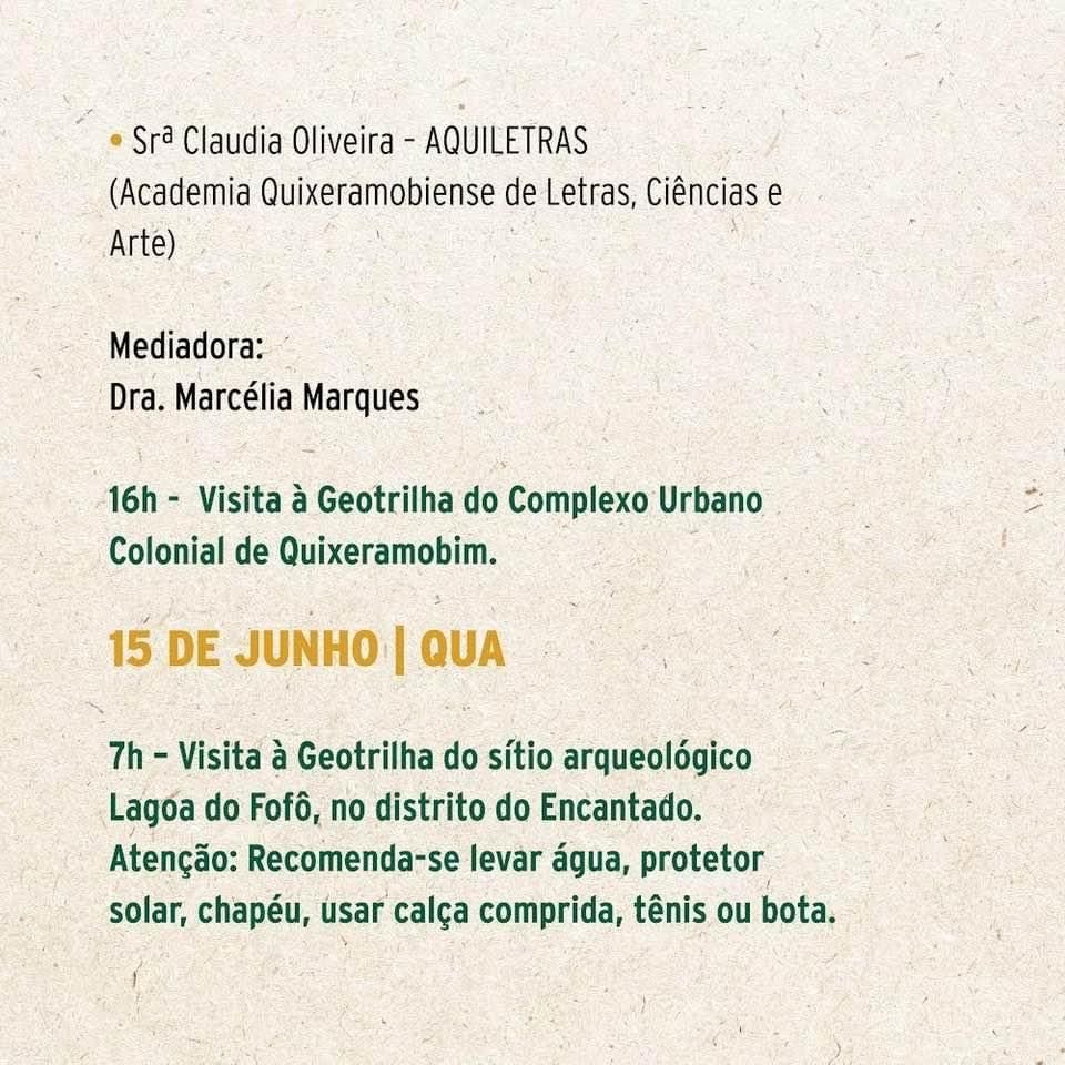 O município de Quixeramobim, no Sertão Central, recebe nesta terça e quarta-feira, 14 e 15 de junho, o Projeto Geoparque Sertão Monumental: Natureza, Cultura e Educação. O evento é organizado pela arqueóloga e antropóloga da Feclesc/Uece, Marcélia Marques.