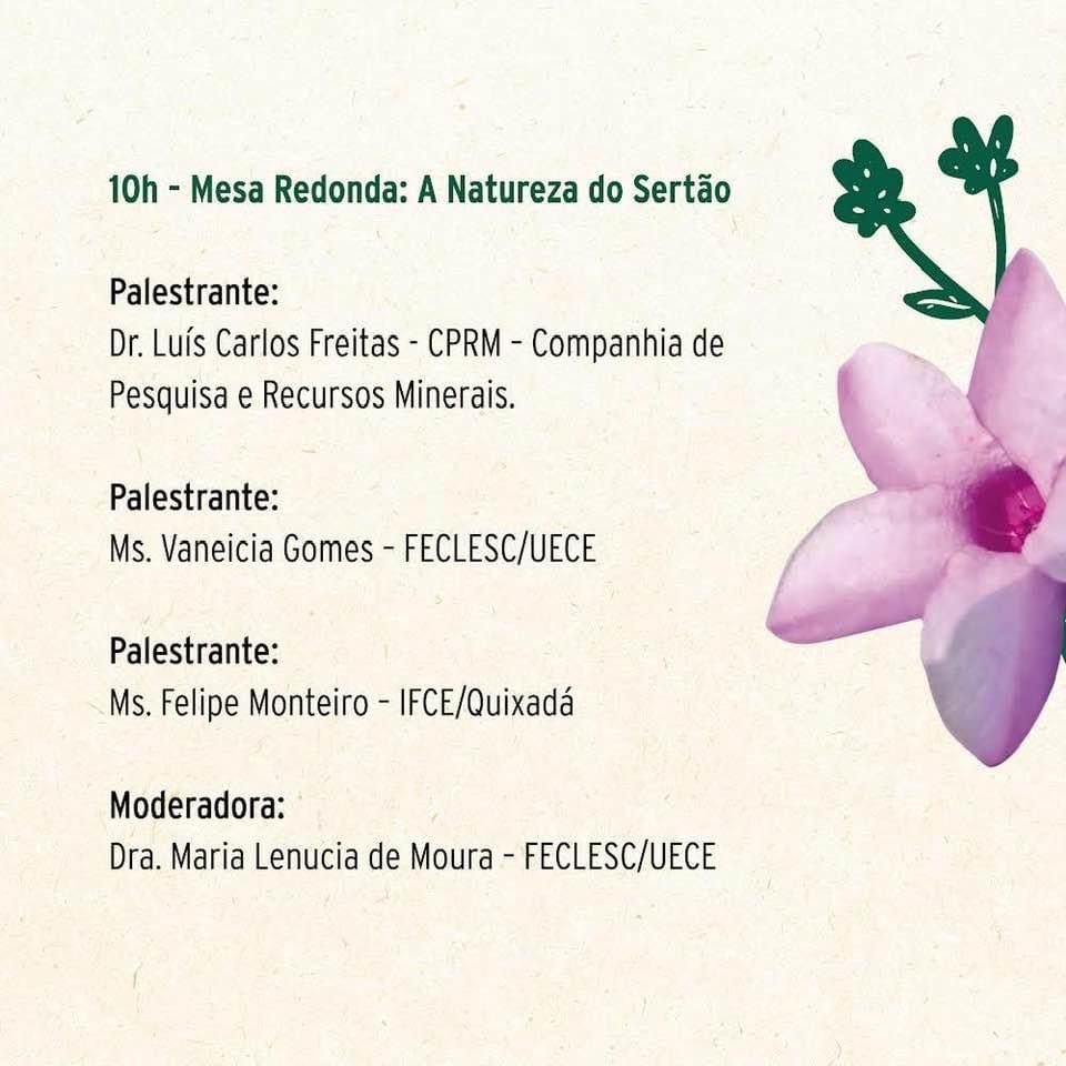 O momento deve contar com a mediação da Dra. Lenúncia de Moura, historiadora da Feclesc/Uece, e a participação de convidados, entre eles, a bióloga Msc. Vaneicia Gomes; o geógrafo e especialista em desenvolvimento e meio ambiente do IFCE, Msc. Felipe Monteiro; e o geólogo Dr. Luís Carlos Freitas.