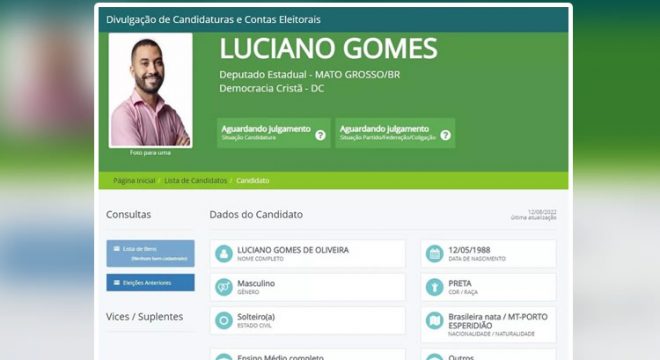 O perfil do pré-candidato a deputado estadual Luciano Gomes de Oliveira de Comodoro, a 677 km de Cuiabá, está cadastrado com a foto de urna do ex-participante do reality show Big Brother Brasil. Uma foto do Gil do Vigor está no site de divulgação de candidaturas e contas eleitorais do Tribunal Superior Eleitoral (TSE).