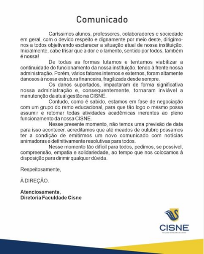 Confira abaixo o comunicado divulgado pela Faculdade Cisne sobre o encerramento de suas atividades educacionais