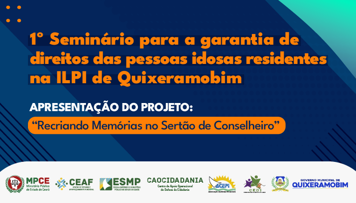 O Ministério Público do Estado do Ceará (MPCE) vai apresentar em Quixeramobim, nesta quinta-feira (20/10), o “seminário para garantia de direitos das pessoas idosas residentes na Instituição de Longa Permanência para Idosos (ILPI) de Quixeramobim”. Na ocasião, também ocorrerá o lançamento do projeto “Recriando Memórias no Sertão de Conselheiro” e a abertura da exposição fotográfica “Memórias de Permanência”. As palestras do seminário irão acontecer a partir das 8h, na Escola Profissionalizante José Alves da Silveira, localizada na Av. Humberto Sena, 250, bairro Distrito Industrial. O evento terá vagas limitadas, com inscrições feitas na plataforma online de cursos e eventos da ESMP/CEAF.