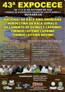 A maior Exposição de Ovinos e Caprinos do Ceará, a Expocece, comemora este ano em Quixadá a sua 43ª edição, sendo realizado nos dias 17 a 23 de outubro, no Parque Valdir do Couto Dinelly. A realização da Associação dos Criadores de Ovinos e Caprinos do Estado do Ceará (ACOCECE) tem em sua programação o julgamento de caprinos e ovinos em diversas categorias, além de palestras técnicas, leilão de raças e apresentações culturais. Ocorre ainda o Desfile da Garota EXPOCECE/2022.