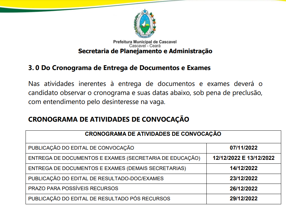 “O candidato deverá se apresentar conforme data prevista no cronograma acima, na Casa dos Conselhos Municipais de Educação, localizada à Rua Francisco Galdino de Sousa, 2054, Centro de Cascavel-CE, munido de todos os documentos e exames solicitados, no horário das 08:00h às 12:00h e das 13:00h às 17:00h”, informa o edital.