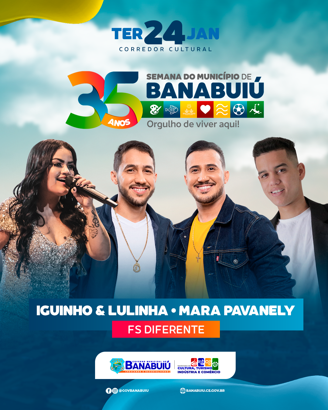Na noite do dia 24 de janeiro, Banabuiú vai celebrar seus 35 anos ao som de Fábio Silva, o FS diferente, atração do próprio município. Além dele, a gestão anunciou a cantora Mara Pavanely, uma grande cantora de forró com anos de estrada. A atração da noite ficou por conta do grande sucesso Iguinho e Lulinha que vem arrastando multidões por onde passa.