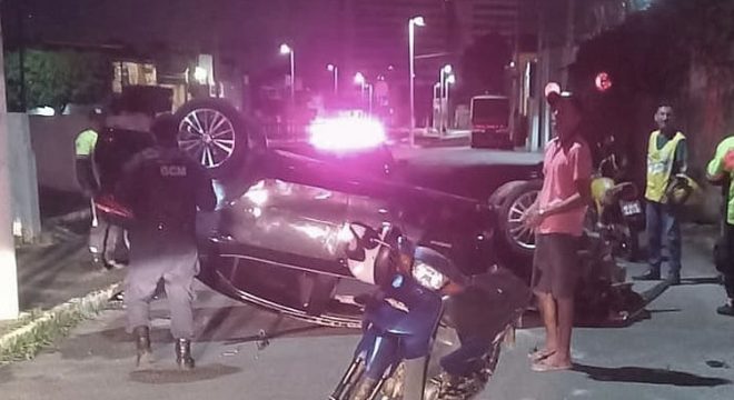 Carro capotou esta madrugada no centro de Crato (Foto: Reprodução)
