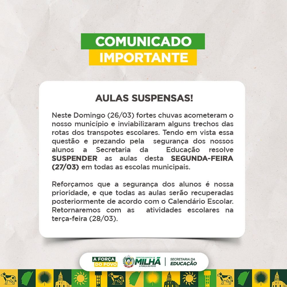 A Prefeitura de Milhã, no Sertão Central, anunciou na noite deste domingo, 26, que as aulas desta segunda-feira, 27, estão suspensas por conta das fortes chuvas que inviabilizaram a circulação dos transportes escolares em vários trechos do município. Em nota nas redes sociais, a Prefeitura disse que “nesse período chuvoso pelo qual estamos passando é preciso ter cuidado redobrado”.