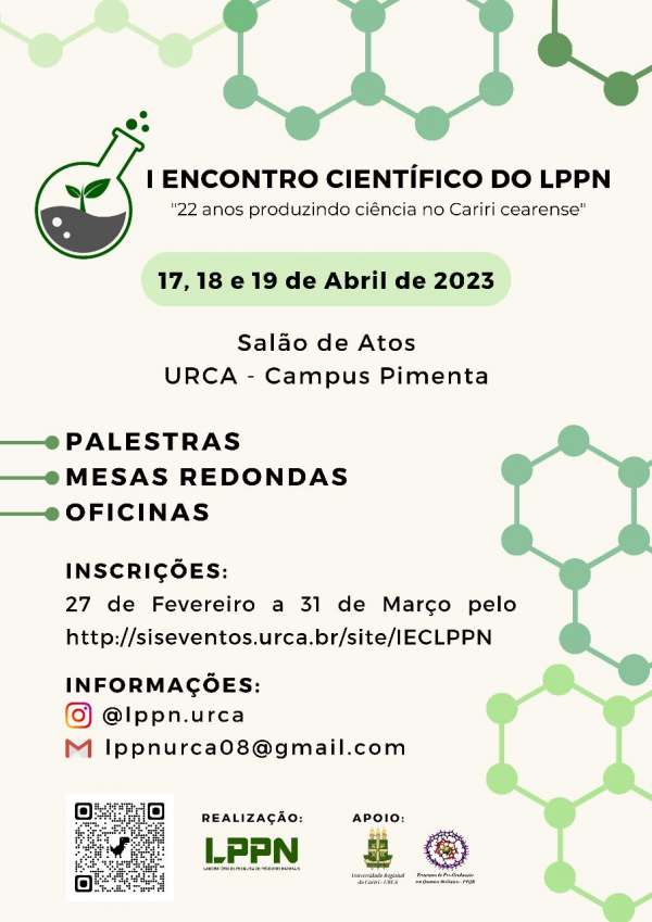 Na manhã de hoje acontece o credenciamento dos participantes e a abertura será a partir das 13h, com mesa redonda sobre o “LPPN: 22 anos produzindo ciência no Cariri cearense”, com o Prof. Dr. José Galberto Martins da Costa (Coordenador do LPPN), a Prof.ª Dr.ª Fabíola Fernandes Galvão Rodrigues (Docente permanente do PPQB) e o Prof. Dr. Aracélio Viana Colares (Docente Unileão).