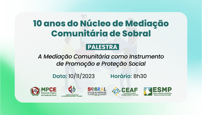 O Ministério Público do Estado do Ceará (MPCE) promove no dia 10 de novembro, em Sobral, a palestra “A Mediação Comunitária como Instrumento de Promoção e Proteção Social”, em alusão aos 10 anos do Núcleo de Mediação Comunitária (Numec) de Sobral. A ação, realizada pelo Numec de Sobral e pelo Centro de Estudos e Aperfeiçoamento Funcional (Ceaf), com apoio da Escola Superior do Ministério Público (ESMP), é aberta ao público e ocorrerá das 8h30 às 12h no Centro de Ciências da Saúde da Universidade Estadual Vale do Acaraú (CCS/UVA).