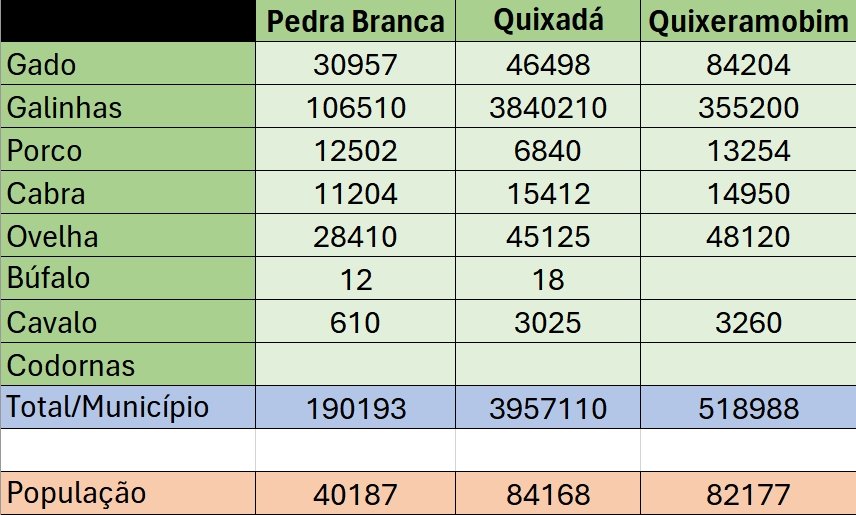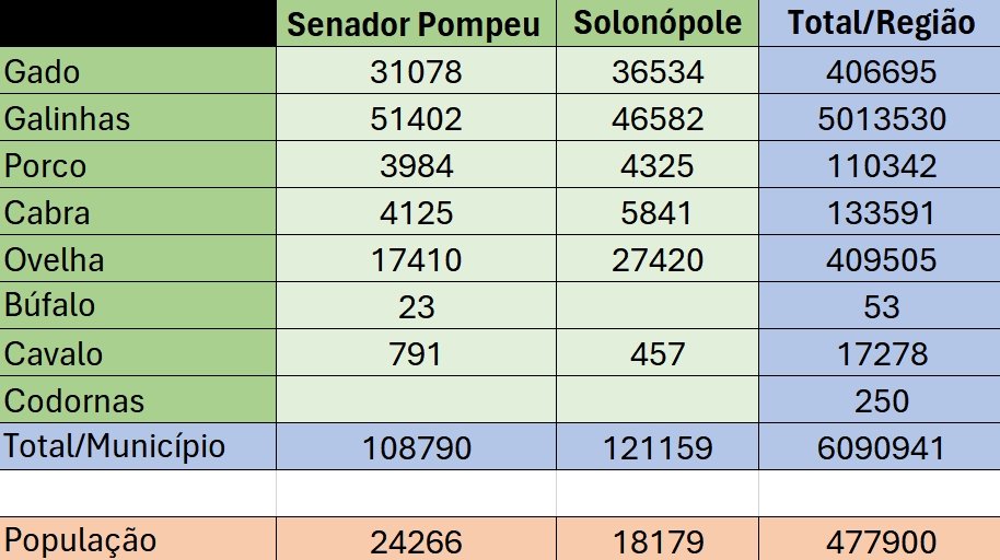No Sertão Central, o somatório de todos rebanhos chega a 6,09 milhões de animais. Somente o total de gados e galinhas (5,4 milhões) equivale a 11 vezes mais que a população somada dos 14 municípios da região (477.900).