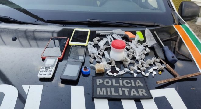 No imóvel, os policiais encontraram, ainda, 41g de maconha, 3g de cocaína, duas pedras de crack, um recipiente contendo 72g de um pó branco, uma ferramenta de violar ignição de motocicletas, um simulacro de revólver e cinco smartphones, sendo três bloqueados.
