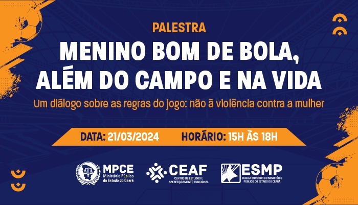 O Ministério Público do Estado do Ceará, por meio da 2ª Promotoria de Justiça de Acopiara, do Centro de Estudos e Aperfeiçoamento Funcional e da Escola Superior do Ministério Público (ESMP), irá promover, nesta quinta-feira (21/03), na zona rural do município, uma palestra sobre violência contra a mulher para adolescentes que treinam para serem jogadores de futebol. O evento “Menino bom de bola, além do campo e na vida. Um diálogo sobre as regras do jogo: não a violência contra mulher” irá ocorrer na sede da Academia Blockchain Sports, das 15h às 18h, e tem como objetivo introduzir os jovens esportistas no debate sobre a importância de se combater a violência de gênero na comunidade local e outros lugares em que poderão estar.