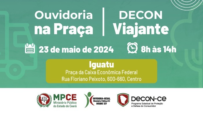 O Ministério Público do Estado do Ceará levará, na próxima quinta-feira (23/05), os serviços da Ouvidoria na Praça e do Decon Viajante para a Praça da Caixa Econômica Federal, em Iguatu. O projeto atenderá os cidadãos do município, das 8h às 14h, levando informações sobre as atribuições do MP estadual e suas unidades ministeriais especializadas. Já a equipe do Programa Estadual de Proteção e Defesa do Consumidor (Decon) irá prestar atendimento aos consumidores que precisam fazer reclamações e renegociações de dívidas com condições especiais de desconto e parcelamento do débito.