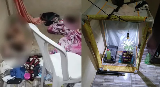 Crianças com suspeitas de maus tratos e planta de maconha encontrada numa estufa (Foto: Reprodução)