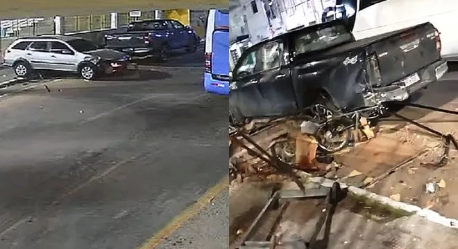 Motorista conseguiu tirar o carro deixando no local bancas destruídas e uma caminhonete (Foto: Reprodução/Vídeo)