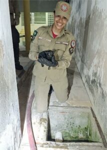 Em resumo, a guarnição resgatou o filhote de gato ileso da tubulação, sem quaisquer intercorrências que pudessem comprometer a segurança dos envolvidos. Finalmente, o felino foi devolvido são e salvo aos cuidados de sua tutora, que expressou gratidão.