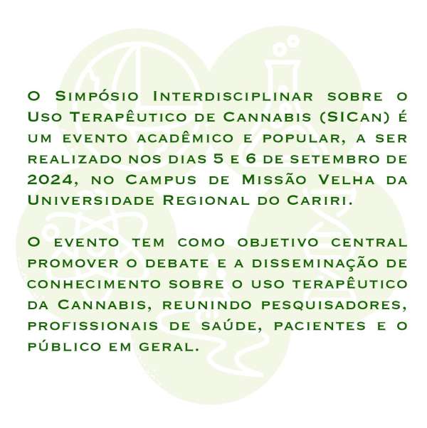 Nos dias 5 e 6 de setembro de 2024, o Campus de Missão Velha da Universidade Regional do Cariri (URCA) sediará um evento inovador e de extrema relevância para a comunidade acadêmica e a sociedade: O I Simpósio Interdisciplinar sobre o Uso Terapêutico de Cannabis (SICan). Este simpósio é um marco para a URCA e para o Cariri, sendo um dos primeiros eventos na região a reunir pesquisadores, profissionais de saúde, pacientes e o público em geral para discutir os avanços científicos, aspectos legais e as práticas terapêuticas associadas ao u\so medicinal da Cannabis.