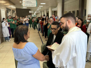 “Não tive como conter as lágrimas, pois mesmo ele já sabendo do seu diagnóstico, quis casar e receber as bênçãos de Deus. Ficou claro também a pressa que ele tinha tinha em realizar esse momento. Esse paciente me ensinou muito e ele nem sabe, me fez mais ainda querer viver o hoje da melhor forma e agradecer a Deus por tanto e tudo o que tenho em minha vida”, relatou a analista de Desenvolvimento Humano e Organizacional do HRVJ, Gene Kelly Targino.