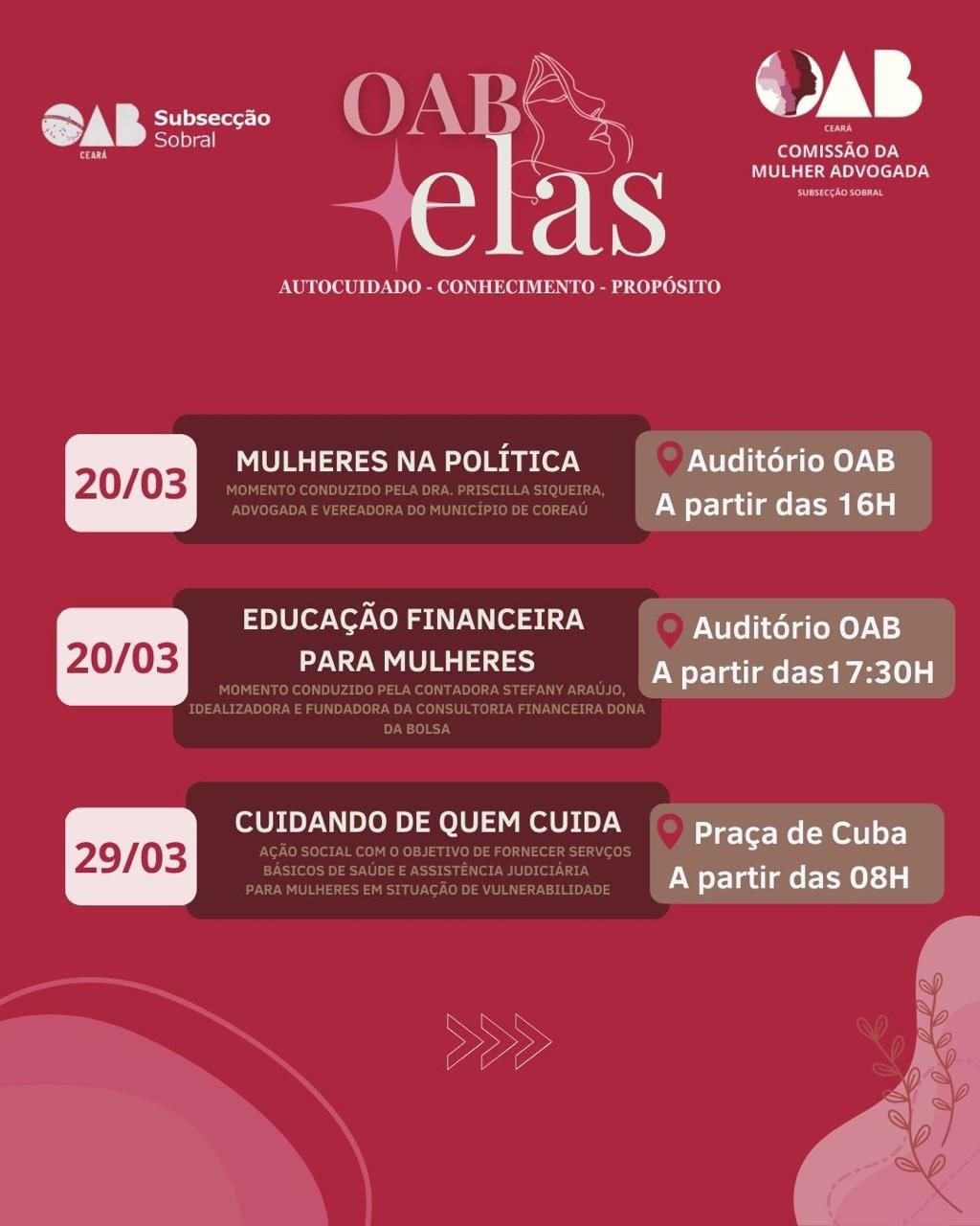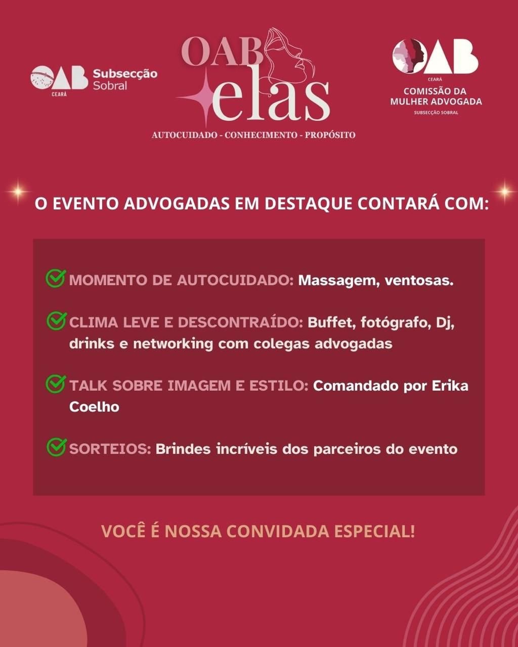 A Ordem dos Advogados do Brasil Subsecção Sobral, por meio da Comissão da Mulher Advogada, tem o prazer de convidar o Sobral Portal de Notícias para prestigiar e registrar o evento “Advogadas em Destaque”, que ocorrerá no dia 8 de março de 2025, às 15h, no Sobral Shopping.