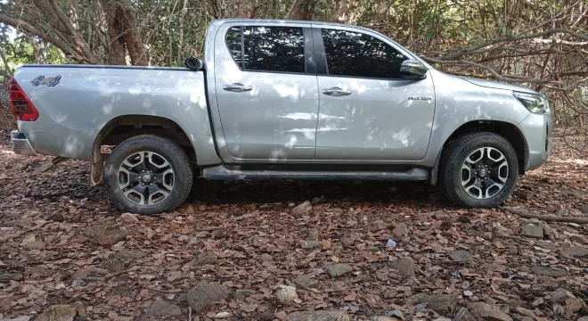 Dentro do carro usado pelos criminosos, a polícia apreendeu dois celulares, três relógios, controles de TV, um bloqueador de sinal, três cordões, uma luneta, R$ 572 em espécie, quase R$ 18 mil em cheques, 10 gramas de maconha, a chave da Hilux e o manual do veículo.