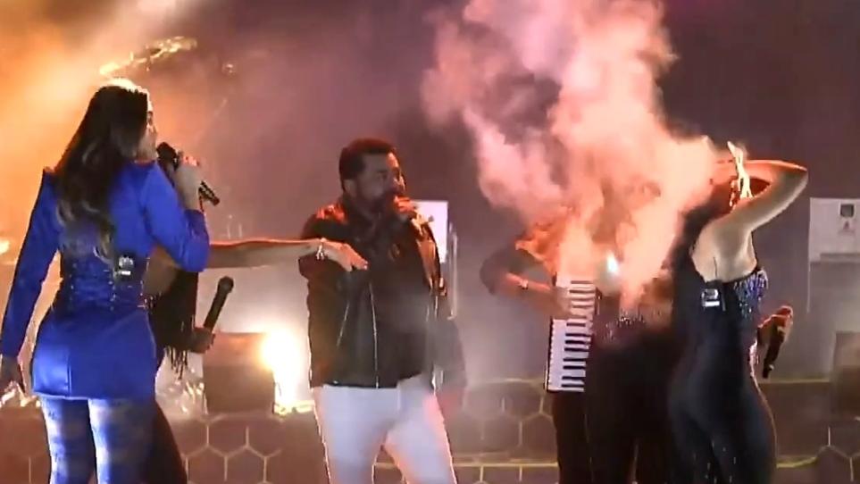 Nas imagens da transmissão oficial do governo é possível ver o momento em que as chamas atingem o cabelo da cantora.