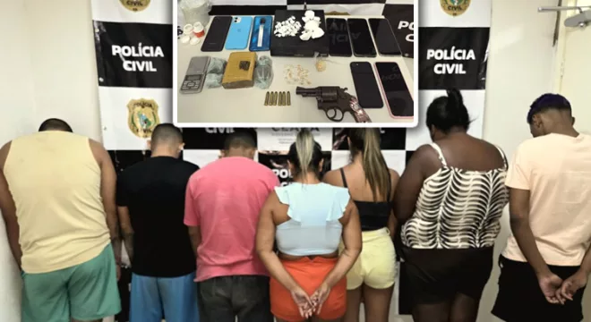 Policiais civis da Delegacia de Barbalha prenderam três mulheres, três homens e apreenderam um adolescente investigados por tráfico de drogas. Os oficiais investigadores cumpriram Mandados de Prisões Preventivas e de Busca e Apreensão na tarde desta quinta-feira (17) no bairro Barro Branco do município. Na ação de combate ao tráfico de drogas em Barbalha, eles apreenderam armas de fogo, substâncias entorpecentes e aparelhos celulares.