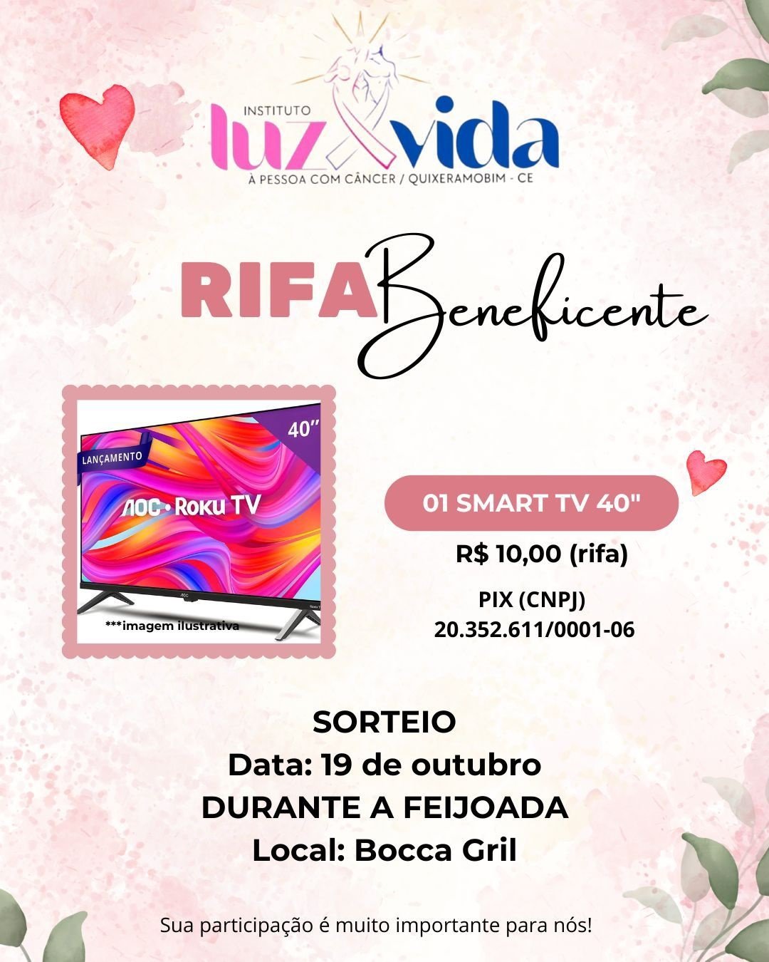 O Instituto Luz e Vida À Pessoa com Câncer, sediado em Quixeramobim, está promovendo uma rifa beneficente com o objetivo de arrecadar fundos para suas ações de apoio a pacientes oncológicos. O prêmio é uma televisão Smart de 40 polegadas, e cada ponto da rifa custa apenas R$ 10.