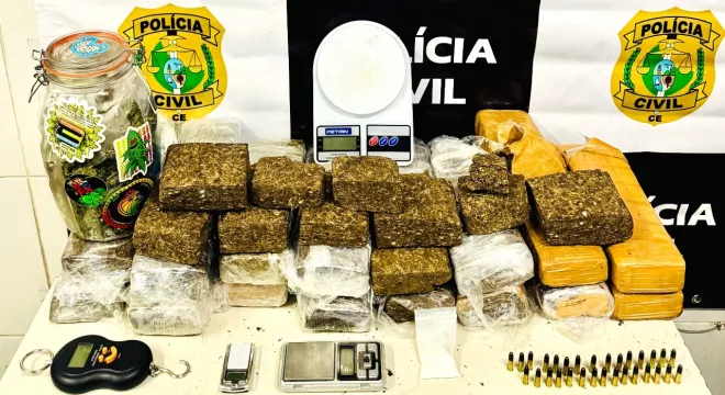 Três homens e uma mulher foram presos por policiais civis da 2ª Seccional de Interior Sul em Juazeiro que apreenderam boa quantidade de drogas. Foi por volta das 22 horas desta quinta-feira (25) em imóveis nos bairros Jardim Gonzaga e Frei Damião. Foram presos em flagrante pelos oficiais investigadores Victor Bierhals Antunes, de 26, Bruno Bezerra Pereira, de 28, Francisco Fabriano Alencar, de 43, e a costureira Maria Leila Bezerra Pereira, de 53 anos.