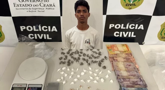 Os agentes foram até a Rua Pio Norões e prenderam Joanderson Ariel Moraes Lima que não respondia procedimentos criminais. Eles apreenderam diversos papelotes de crack, maconha e cocaína, duas balanças de precisão, sacos para embalar drogas e dinheiro trocado. Para acolher denúncias sobre crimes, a Polícia Civil disponibiliza o número do seu WhatsApp (99674-7052) mediante garantia de sigilo quanto à fonte.