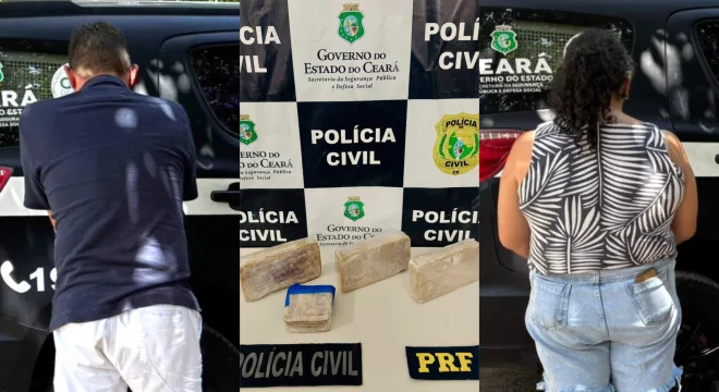 Policiais civis da 2ª Seccional de Interior Sul em Juazeiro prenderam em flagrante um casal que vai responder por tráfico de drogas. Foi na manhã desta sexta-feira (28) na rotatória da Petrobras em Crato após interceptarem um carro que procedia de Fortaleza. Nele estava o casal Robson Assunção de Lima, de 47, e Lucilene Sousa Ribeiro, de 46 anos, residente em Pacatuba.