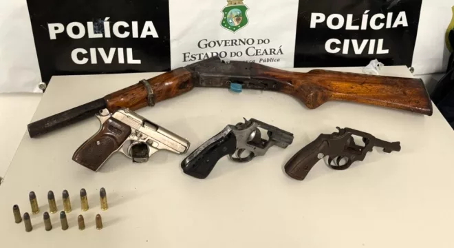 Policiais civis da 2ª Seccional de Interior Sul em Juazeiro prenderam dois homens e apreenderam quatro armas de fogo. Foi por volta das 17 horas desta quinta-feira (06) na Rua Manoel Barreto da Silva (Pedrinhas) em Juazeiro, onde moram Carlos José da Silva, de 29, o “Floresta”, e o garçom Welder Winter Santana de Figueiredo, de 25 anos. Quando estiveram de “campana” os oficiais investigadores já tinham notado movimentação estranha na casa de “Floresta”.
