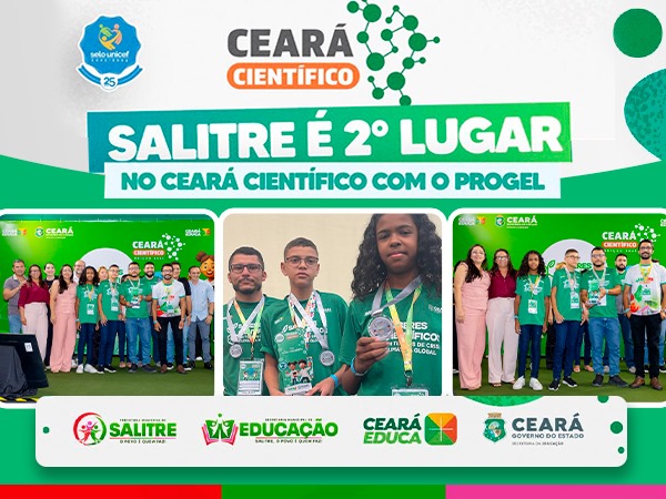 Com uma nota de 99,98, Salitre ficou em 2º lugar na Categoria PCD com o projeto PROGEL, mostrando que com compromisso e educação é possível alcançar objetivos trabalhando a inclusão, a diversidade e o protagonismo estudantil, levando inovação, ciência e a valorização dos saberes do nosso território para todo o Ceará.