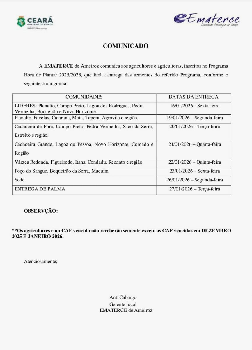 O Escritório da Ematerce do município de Arneiroz inicia nesta sexta-feira (16/01), a distribuição de sementes do Programa Hora de Plantar 2025/2026.