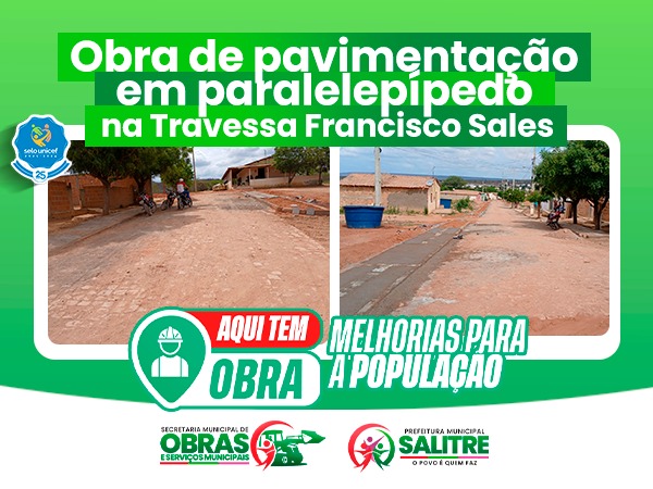 A Prefeitura Municipal de Salitre, por meio da Secretaria Municipal de Obras, continua a avançar com a obra de pavimentação em paralelepípedo na Travessa Francisco Sales, localizada no bairro Alto Alegre.