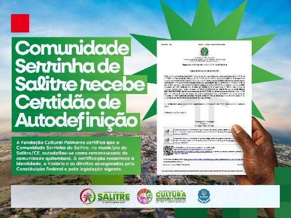 A Prefeitura de Salitre, administração "O povo é quem faz" e a Secretaria de Cultura, Juventude e Turismo anunciam mais um marco histórico: a Comunidade Serrinha de Salitre recebeu sua Certidão de Autodefinição, emitida oficialmente pela Fundação Cultural Palmares. Este documento certifica a comunidade como remanescente de Quilombo.