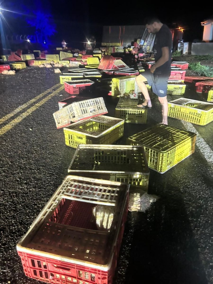Com o capotamento, a carga de frangos ficou espalhada pelo meio da via, causando transtornos no tráfego.