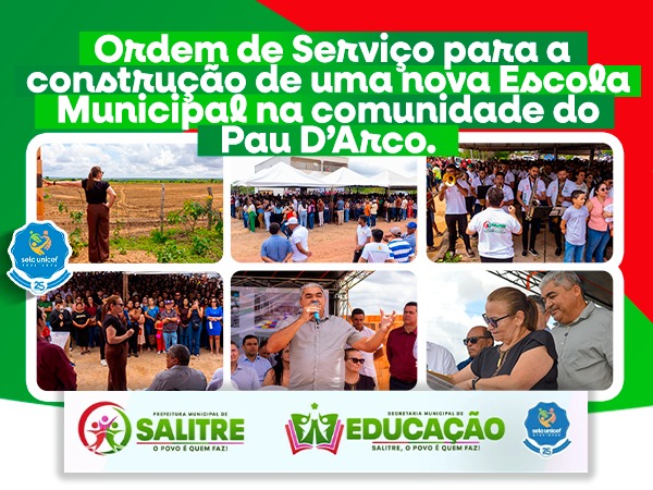 A prefeitura de Salitre, por meio da Secretaria Municipal de Educação, concretizou um marco histórico para o desenvolvimento educacional do município. Na última sexta-feira, dia 20, foi realizado o ato de assinatura da Ordem de Serviço que autoriza o início das obras da nova Escola de Tempo Integral na localidade do Sítio Pau D'Arco. Este projeto simboliza um novo tempo para a educação em Salitre, priorizando a ampliação das oportunidades de aprendizagem, convívio social e desenvolvimento integral das crianças e jovens, e que atenderá todas as comunidades circunvizinhas.