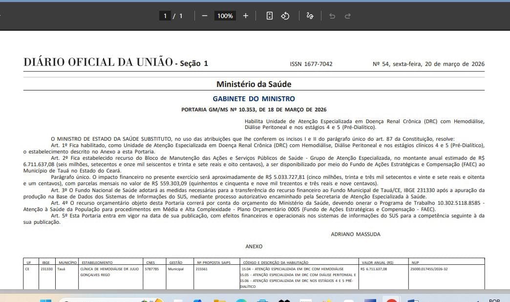 O Ministério da Sáude publicou no Diário Oficial da União desta sexta-feira (20/03), uma Portaria habilitando o Centro de Hemodiálise Dr. Júlio Gonçalves Rêgo, inaugurado na última quarta-feira (18/03), em Tauá, como Unidade de Atenção Especializada em Doença Renal Crônica (DRC).