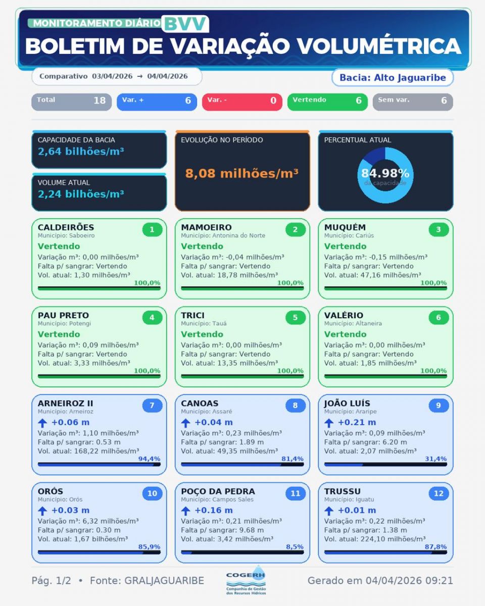 Veja a Boletim Hidrológico da COGERH divulgado neste sábado (04/04)