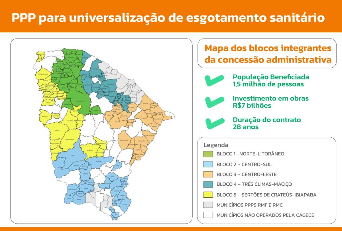 Os municípios contemplados foram organizados em cinco blocos regionais: Norte-Litorâneo, Centro-Sul, Centro-Leste, Três Climas-Maciço e Sertões de Crateús-Ibiapaba. A divisão busca otimizar a gestão dos serviços e garantir maior eficiência operacional na expansão dos sistemas de esgotamento sanitário.